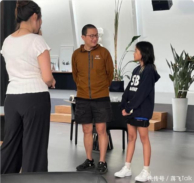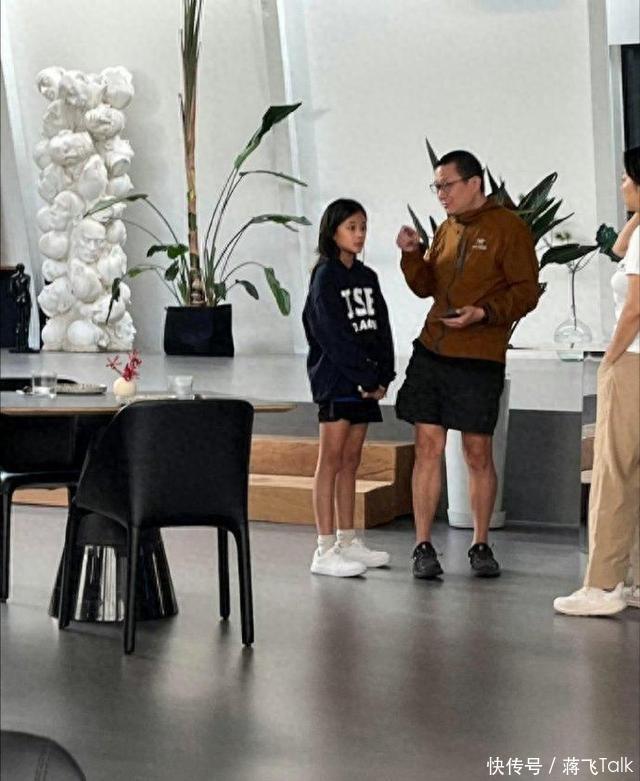 照片中,快快穿一件黑色的卫衣配一件短裤,身形纤细修长,五官精致,扎着丸子头,有些害羞地站在爸爸身边。